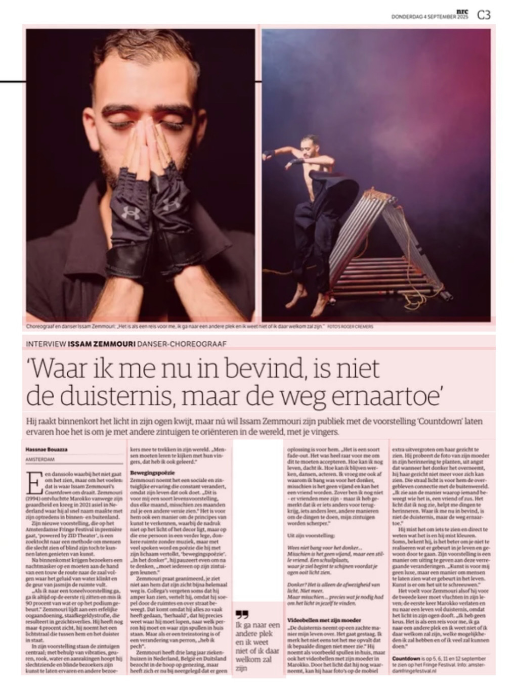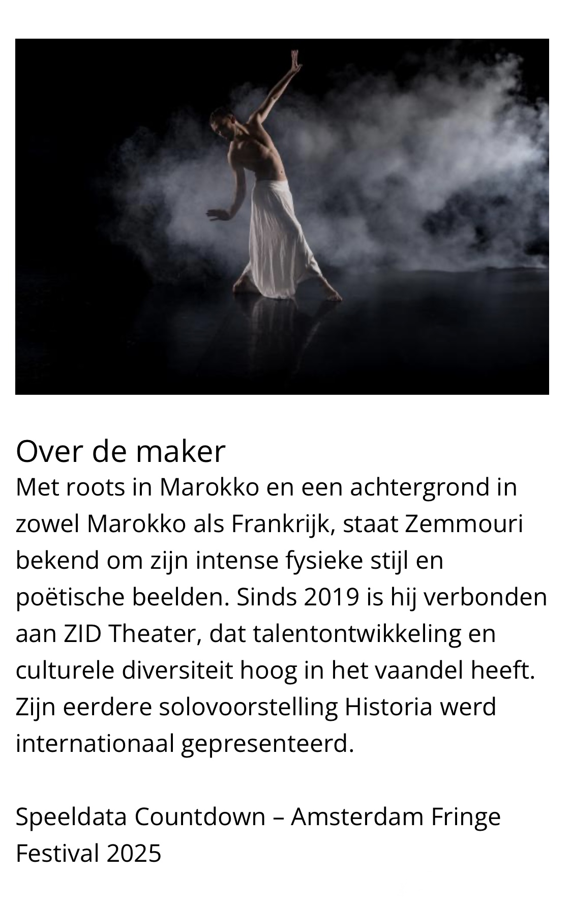 Issam Zemmouri is een choreograaf en danser met een unieke stijl die hedendaagse dans, fysieke expressie en sterke beeldende elementen combineert. Met zijn bijzondere fysieke en beeldende taal transformeert hij de ruimte en het personage steeds opnieuw tot een verrassende beleving. Hij excelleert in het werken met objecten die de perceptie van de toeschouwer uitdagen.